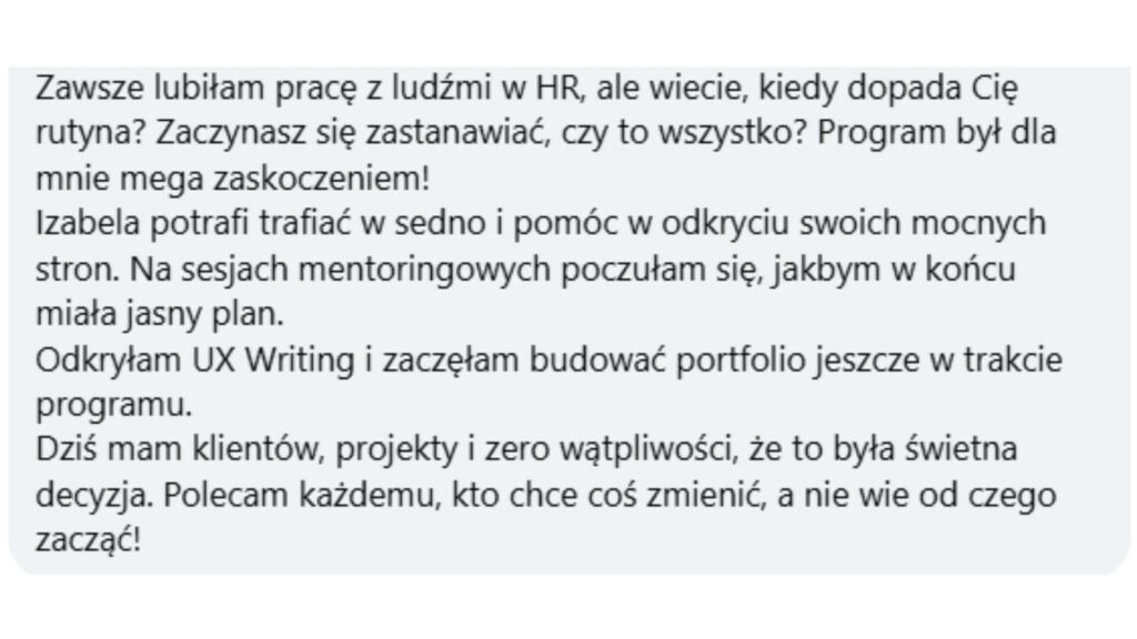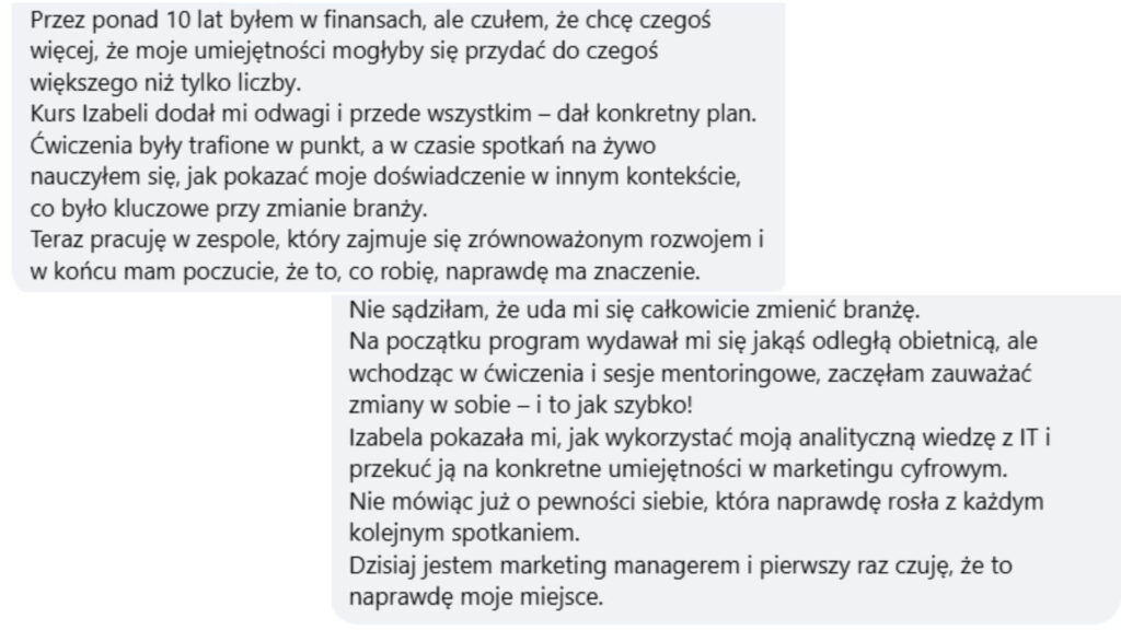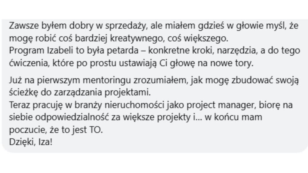 Dzięki kursowi i Dzięki Tobie Iza znalazłam swój cel, odkryłam swoją drogę. Teraz zrobię wszystko ( ułożę konkretny plan działania), żeby ruszyć z miejsca.