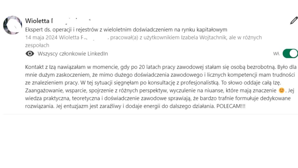 Dzięki współpracy z Izabelą klienci stają się bardziej pewni siebie, znajdują satysfakcjonującą pracę, nie boją się wyzwań, wierzą w swoje możliwości i osiągają wspaniałe cele.